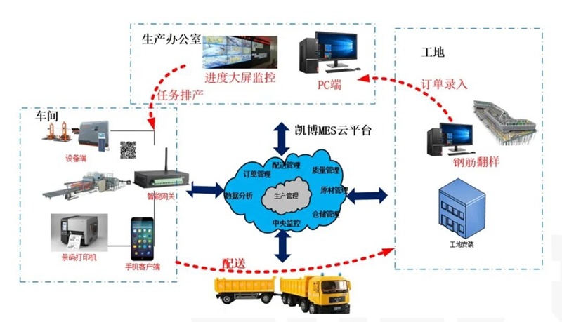 并且,凱博科技攜手中國鐵道科學研究院集團有限公司,開發(fā)凱博鋼筋加工管理軟件系統(tǒng)和鋼筋加工遠程控制系統(tǒng),打造智能控制中心。鋼筋加工管理軟件系統(tǒng)以鋼筋加工過程中物資流管理為核心,借助工業(yè)互聯(lián)網(wǎng)、云服務、智能設備等技術手段,實現(xiàn)多項目多任務遠程訂單管理,實現(xiàn)訂單排產(chǎn)、生產(chǎn)訂單分發(fā)、生產(chǎn)標牌打印、成品完成報工,成品出入庫等功能,同時能夠以電子大屏實現(xiàn)項目訂單動態(tài)實時監(jiān)控、加工廠整體運營狀態(tài)的中心化顯示。鋼筋加工遠程控制系統(tǒng),可實時顯示加工場各種設備生產(chǎn)狀態(tài),同時實現(xiàn)中控室對現(xiàn)場設備啟動和停止的遠程控制,造就了高鐵梁場鋼筋加工數(shù)字化新模式!