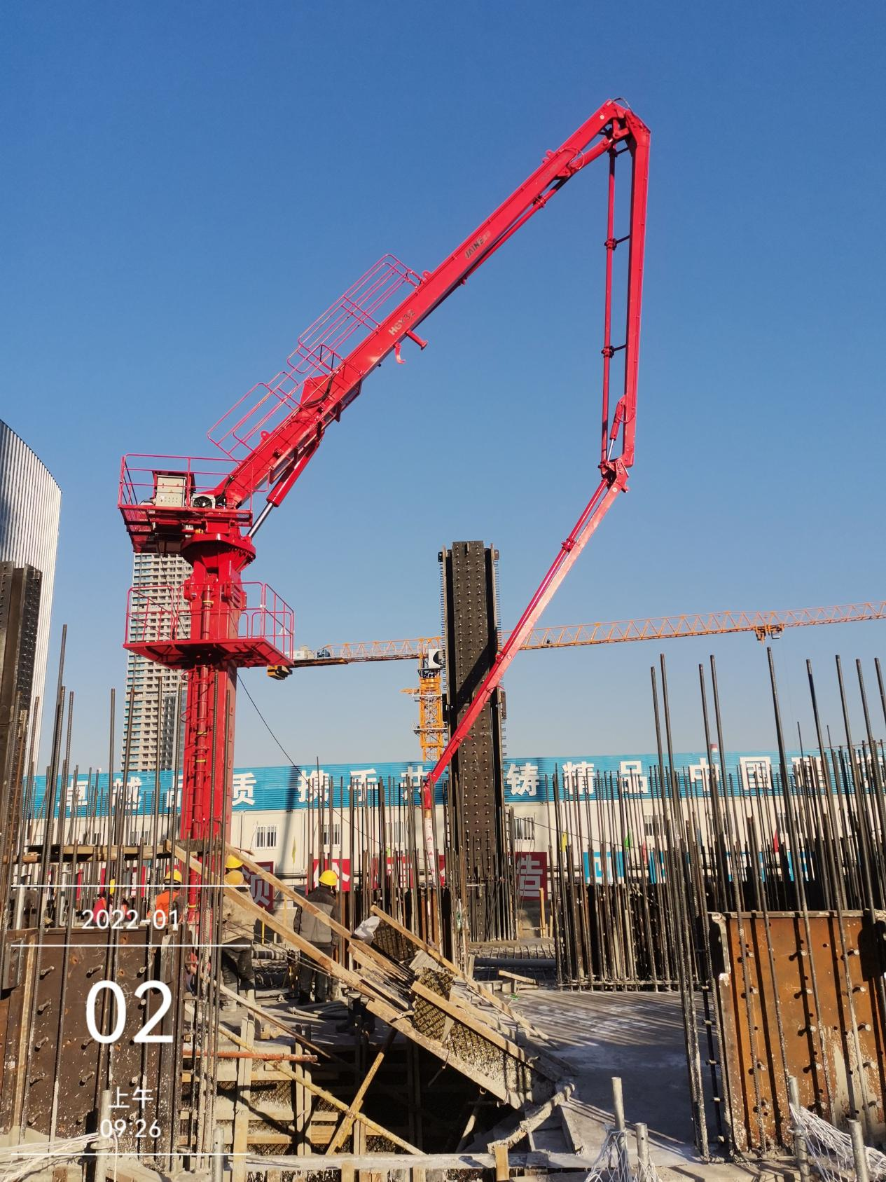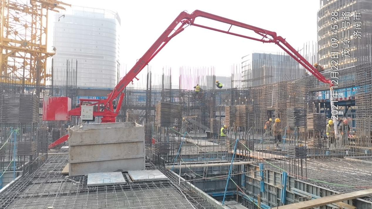 濟(jì)南復(fù)地國(guó)際金融中心260米超高層項(xiàng)目將建53層超高層辦公塔樓一棟,最高處達(dá)260米。該項(xiàng)目總建筑面積128680平方米,地上總建筑面積126267平方米,地上包含辦公、商業(yè)功能區(qū)。地下建筑面積2213平方米。其室外地坪至最高點(diǎn)達(dá)260米。A1地塊總停車位757輛。該項(xiàng)目使用的布料機(jī)為凱博科技生產(chǎn)的HGY15移動(dòng)式布料機(jī)。
